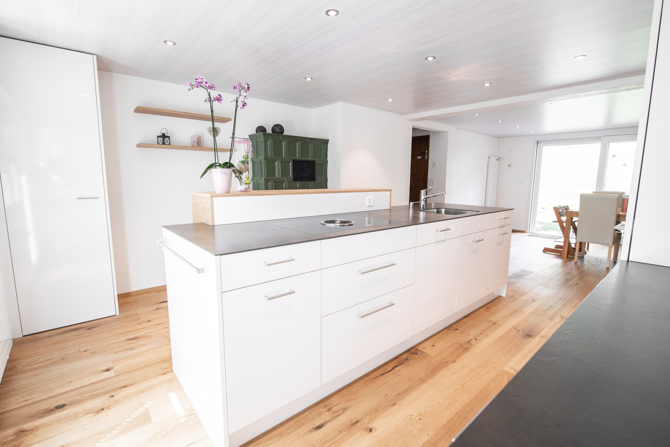 In der Küche treffen warme Naturmaterialien auf elegante Blautöne. Diese bewusste Material- und Farbwahl sorgt für visuelle Ruhe und verbindet die Küche harmonisch mit den angrenzenden Wohnbereichen – für ein Zuhause aus einem Guss.