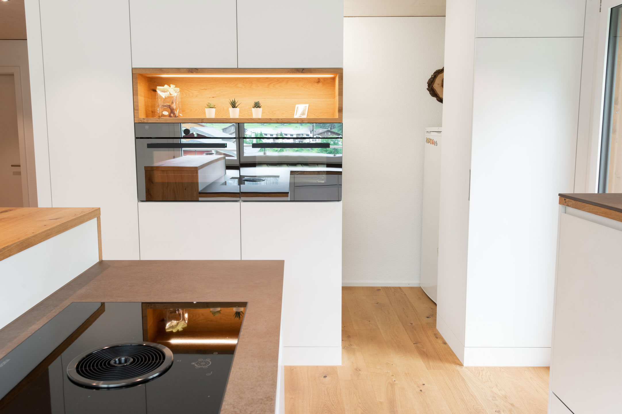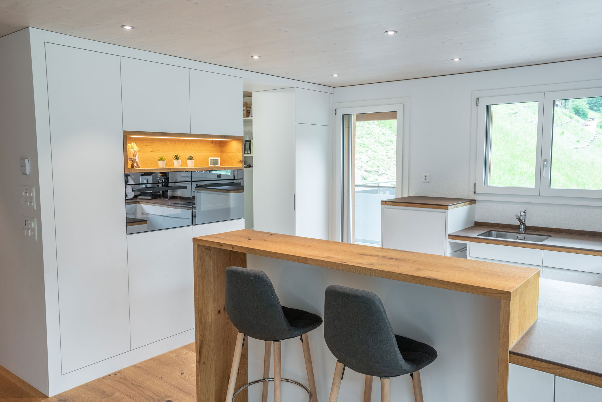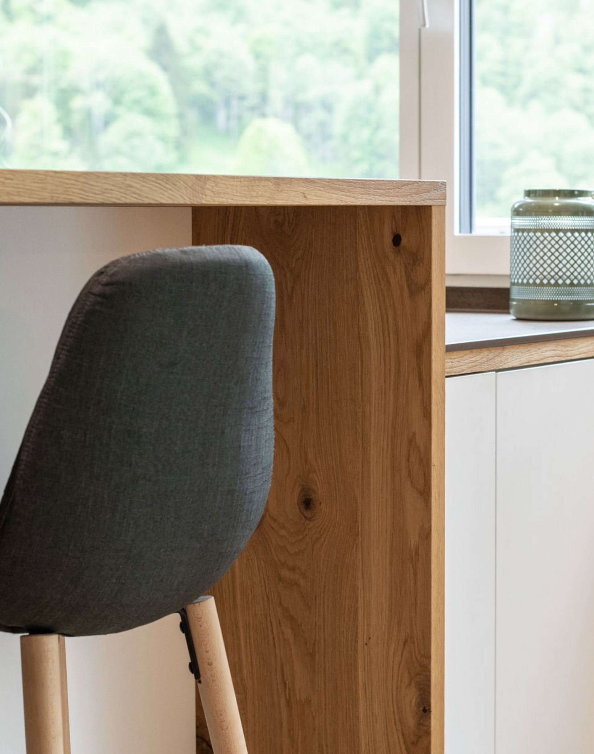 In der Küche treffen warme Naturmaterialien auf elegante Blautöne. Diese bewusste Material- und Farbwahl sorgt für visuelle Ruhe und verbindet die Küche harmonisch mit den angrenzenden Wohnbereichen – für ein Zuhause aus einem Guss.