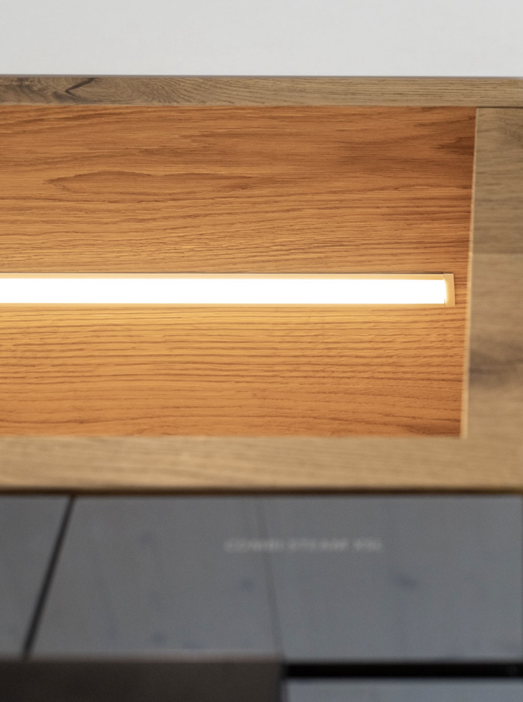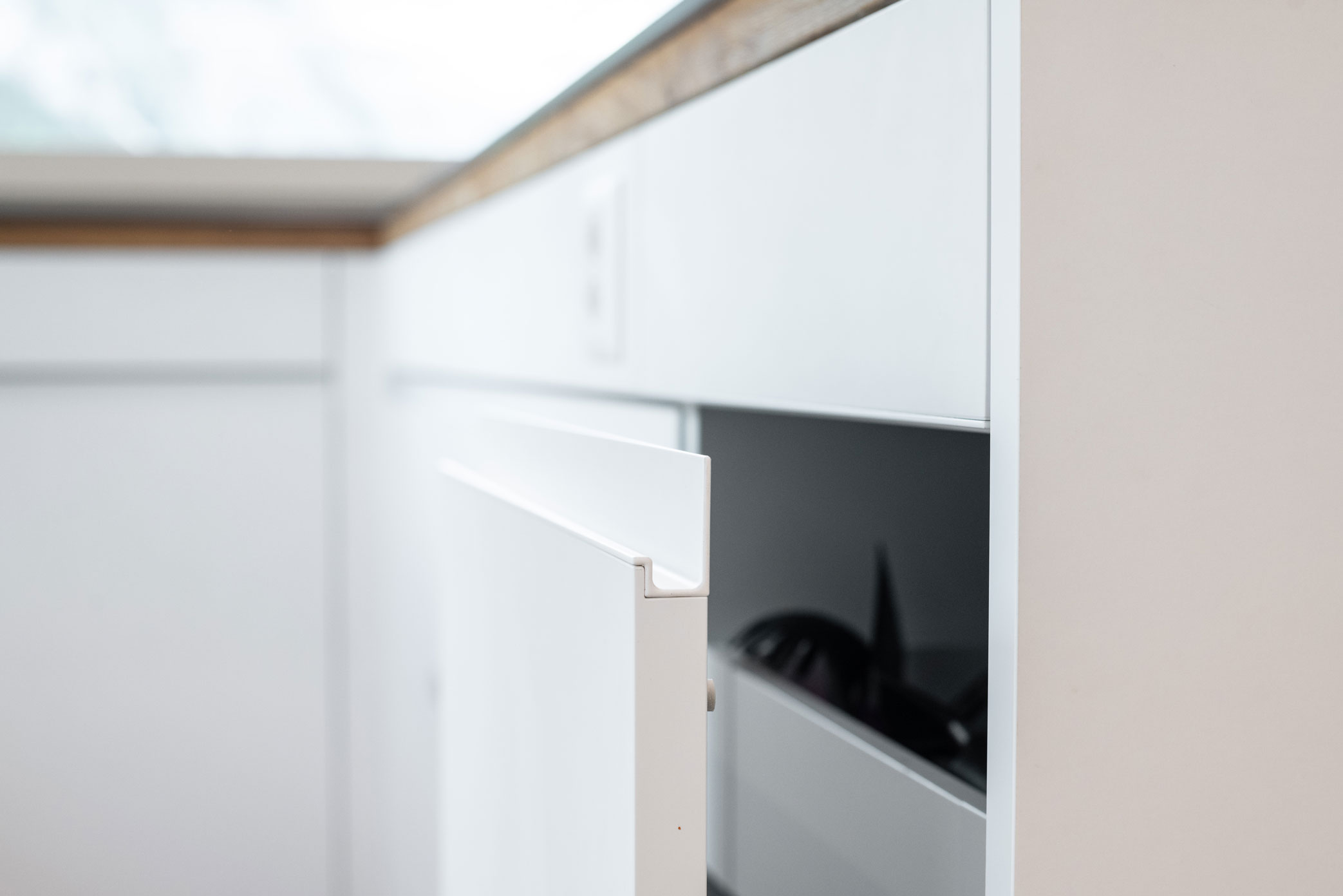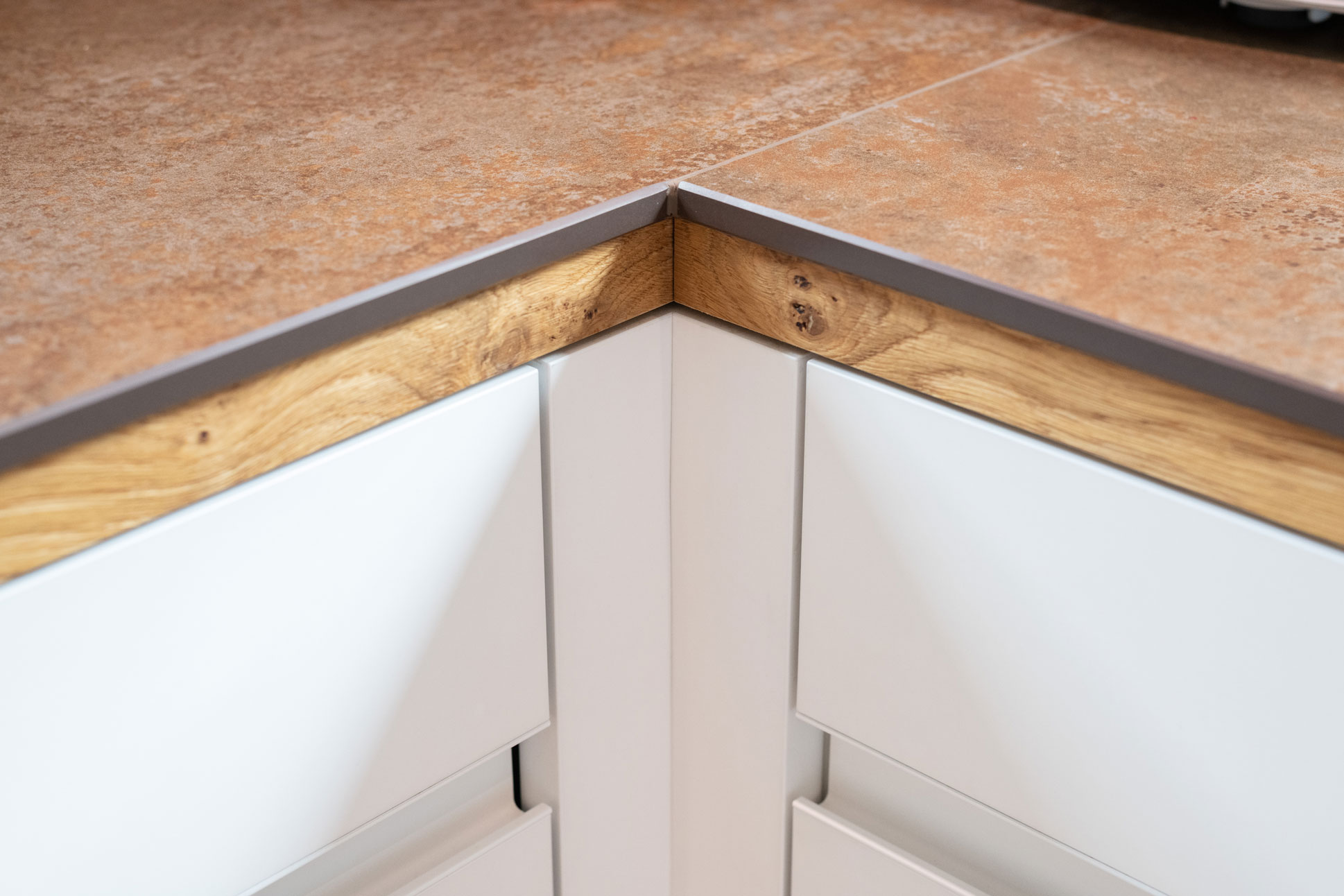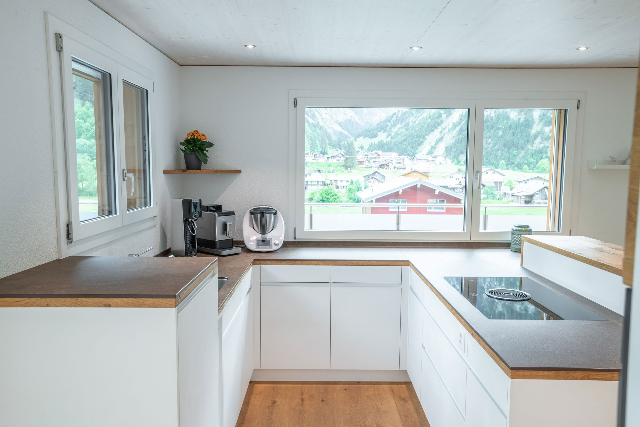 In der Küche treffen warme Naturmaterialien auf elegante Blautöne. Diese bewusste Material- und Farbwahl sorgt für visuelle Ruhe und verbindet die Küche harmonisch mit den angrenzenden Wohnbereichen – für ein Zuhause aus einem Guss.